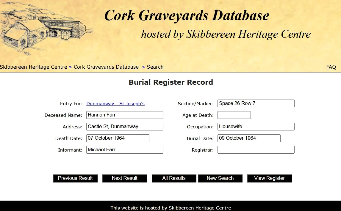Hannah Farr, of 7 Castle Street, died in Dunmanway Hospital on 7 October 1964. She is buried in St. Joseph's Cemetery, Dunmanway in Space 26 Row 7